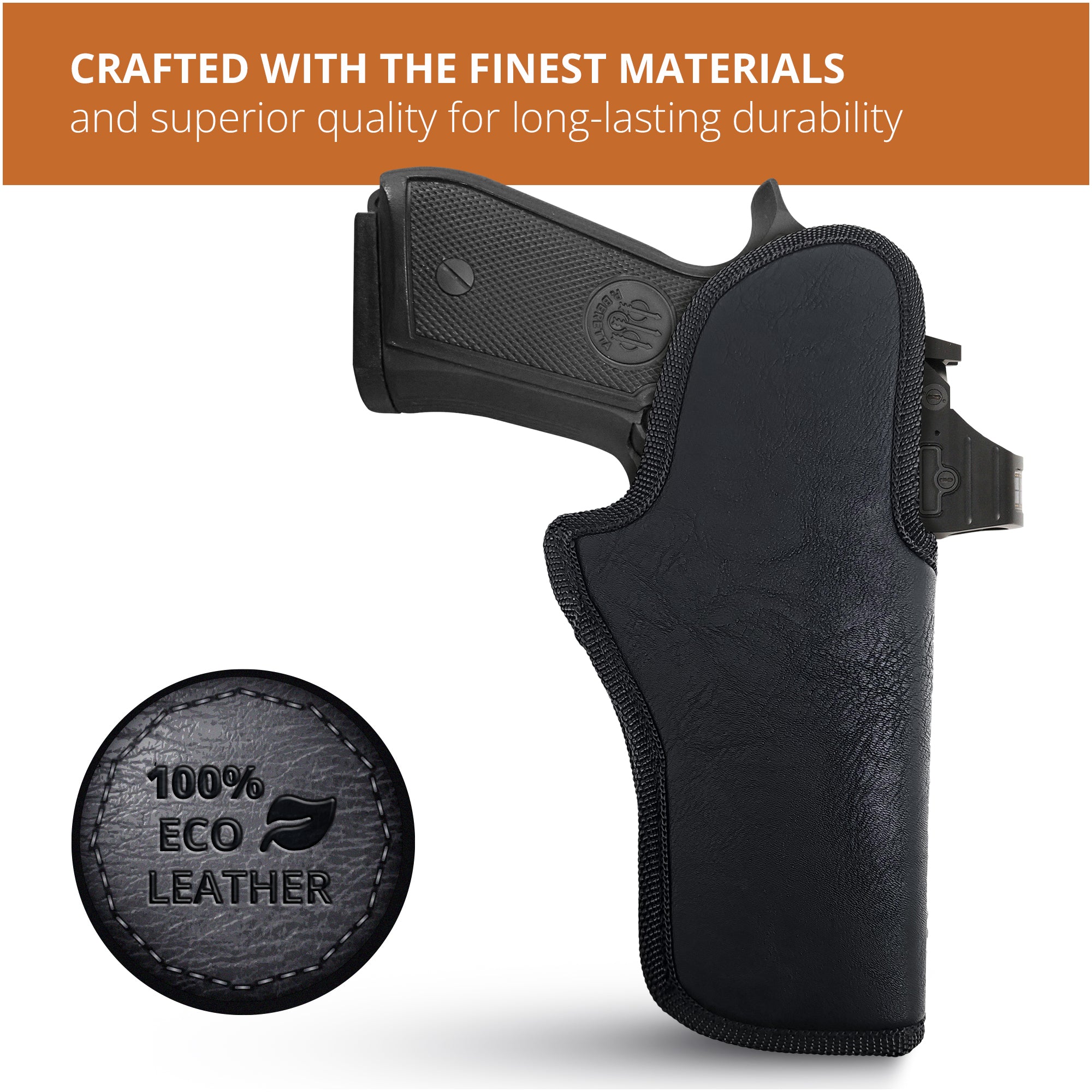 The comfortable soft holster is made in synthetic nubuck (high-density polyurethane) that resists abrasion and moisture. Also, the seams are reinforced with strong polyester thread for added durability.