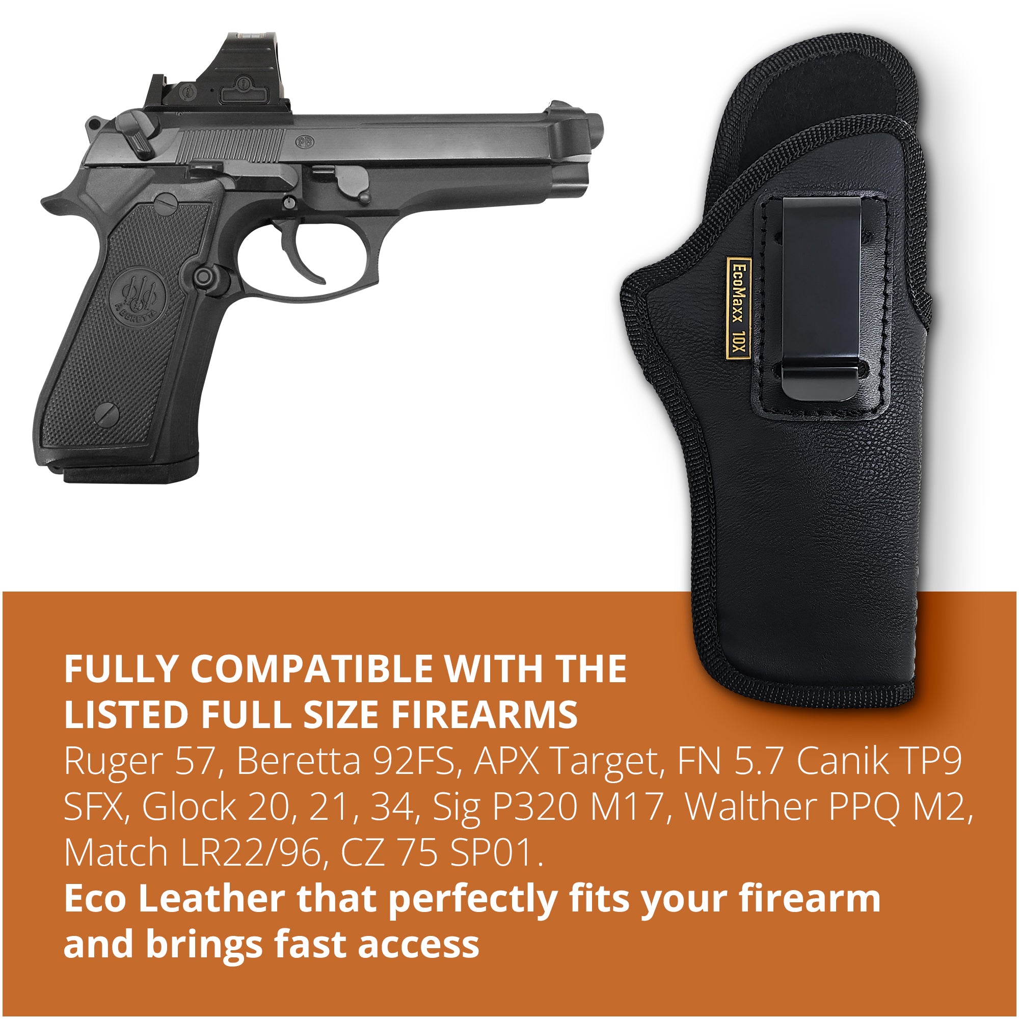 Compatible with Ruger 57, Beretta 92FS, APX Target, FN 5.7 Canik TP9 SFX, Glock 20, 21, 34, Sig P320 M17, Walther PPQ M2, Match LR22/96, CZ 75 SP01. Right Hand.