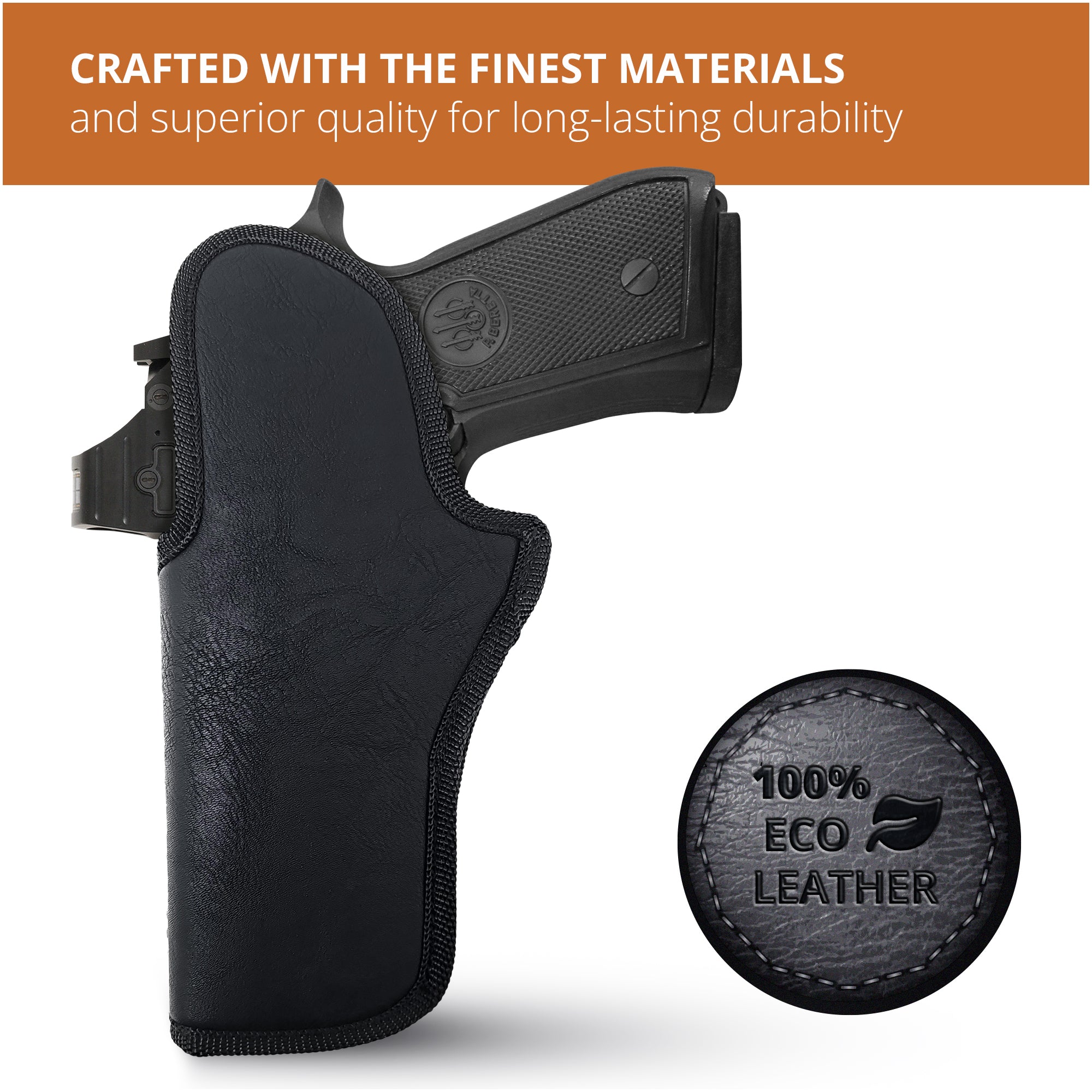 Soft suede interior to protect your gun from scratches. Our gun leather holster is sweat and water resistant, ideal for everyday use or outdoor activities.