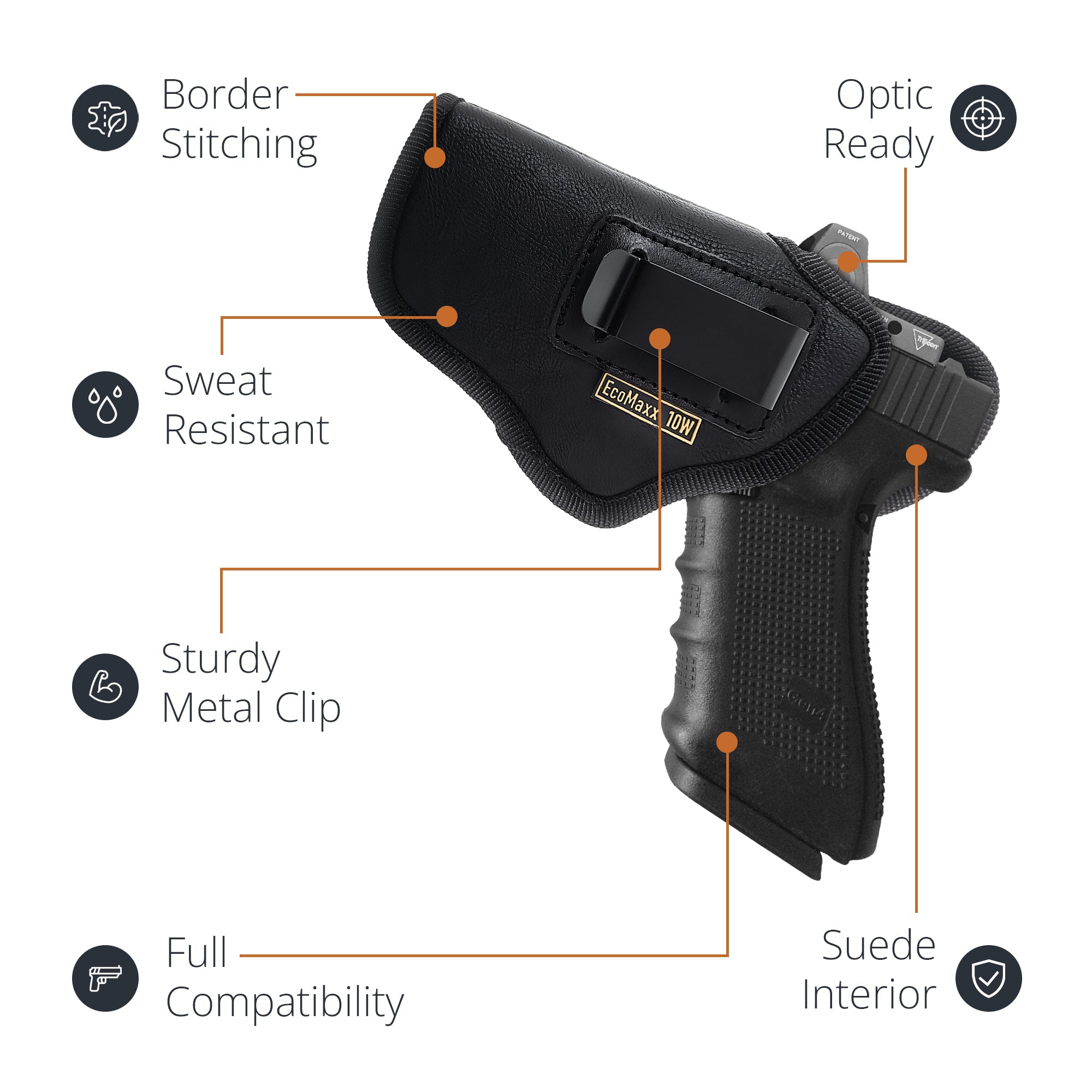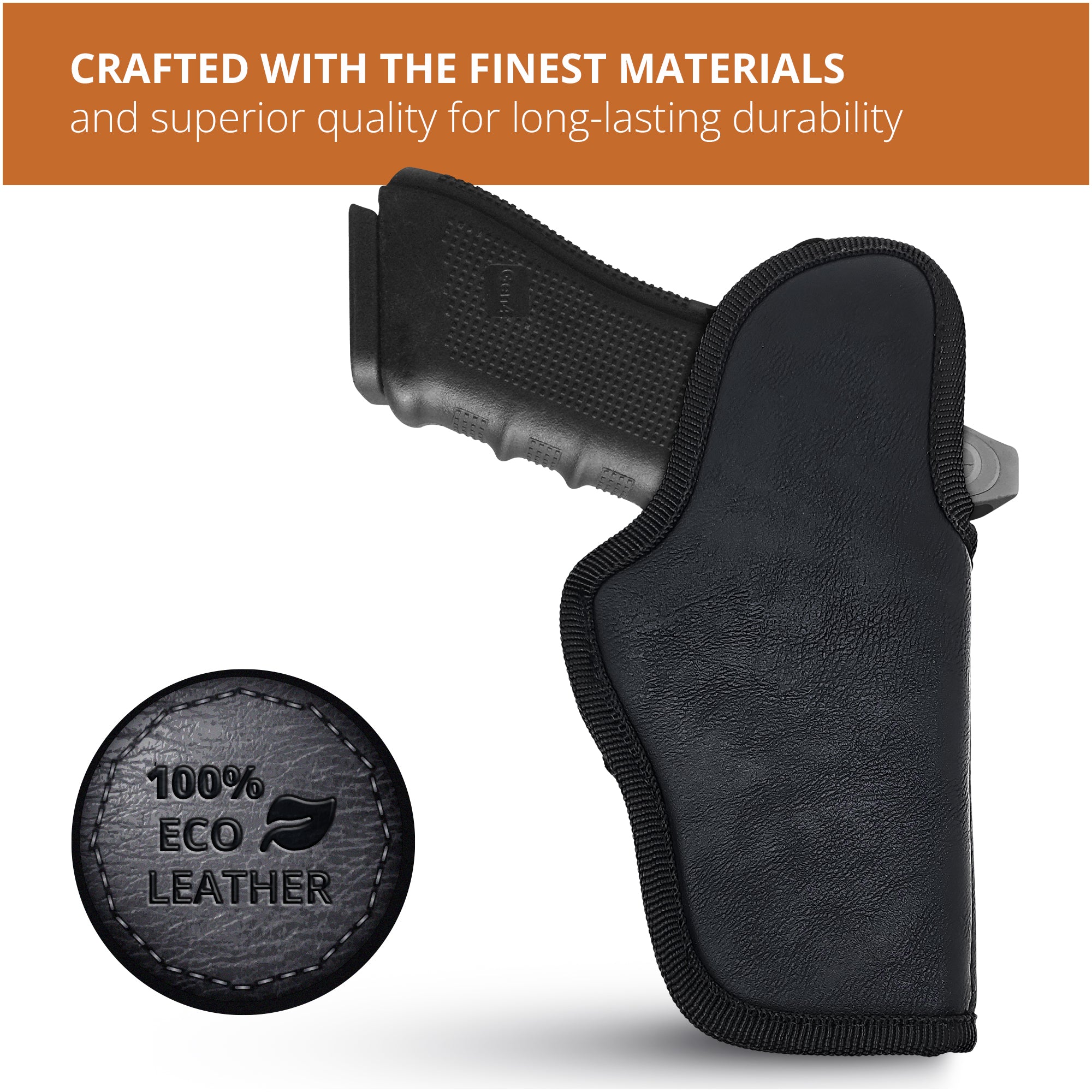 Soft suede interior to protect your gun from scratches. Our gun leather holster is sweat and water resistant, ideal for everyday use or outdoor activities.