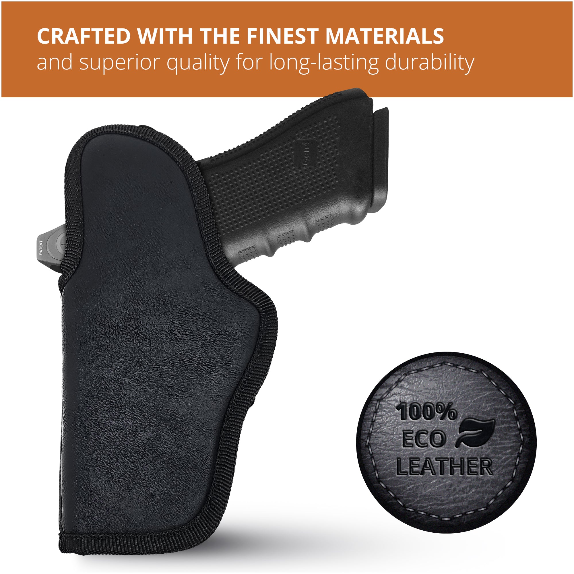 The comfortable soft holster is made in synthetic nubuck (high-density polyurethane) that resists abrasion and moisture. Also, the seams are reinforced with strong polyester thread for added durability.