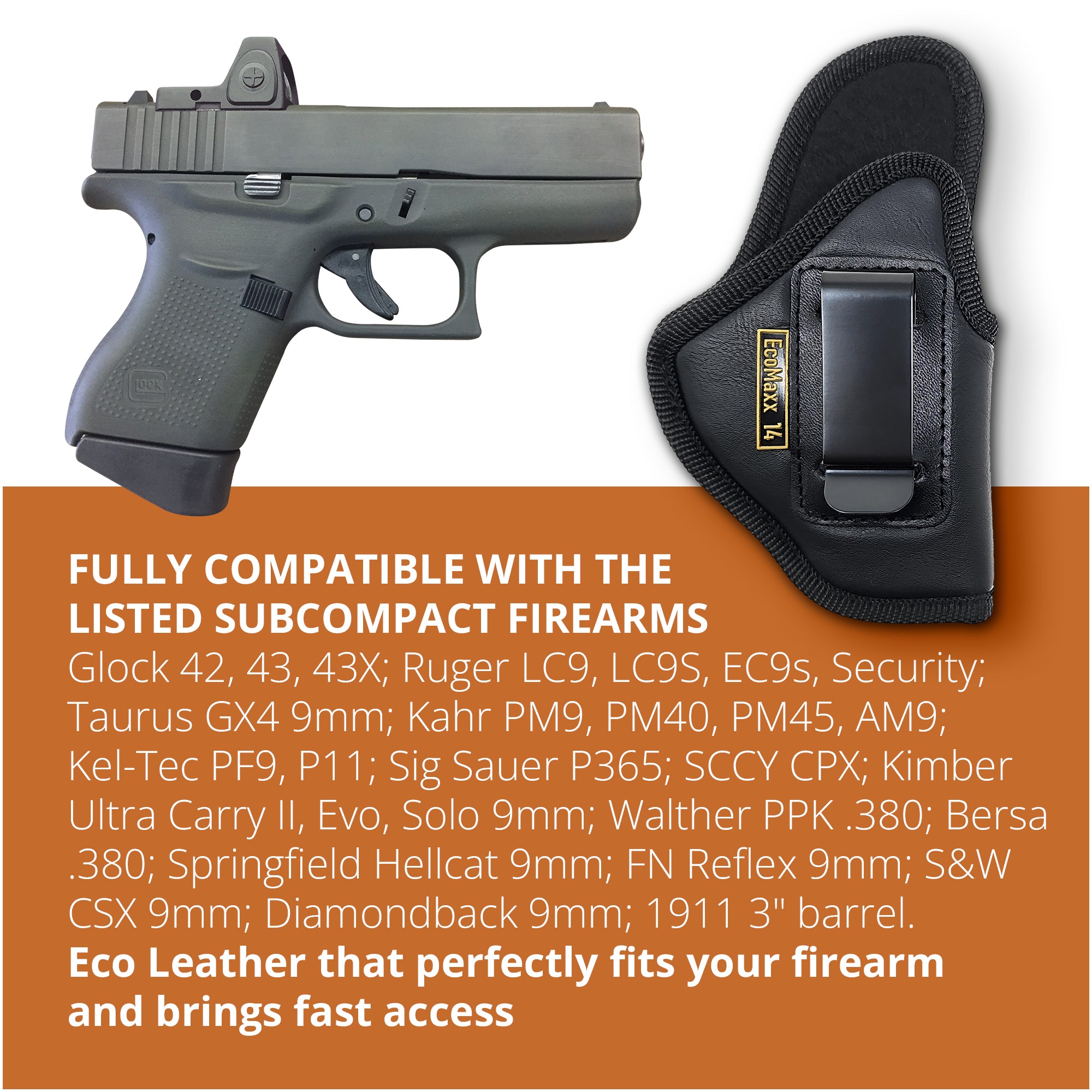 Compatible with Glock 42, 43, 43X; Ruger LC9, LC9S, EC9s, Security; Taurus GX4 9mm; Kahr PM9, PM40, PM45, AM9; Kel-Tec PF9, P11; Sig Sauer P365; SCCY CPX; Kimber Ultra Carry II, Evo, Solo 9mm; Walther PPK .380; Bersa .380; Springfield Hellcat 9mm; FN Reflex 9mm; S&W CSX 9mm; Diamondback 9mm; 1911 3" barrel, H&K CC9, P7 M13, 1791 size MC3. Right Hand.