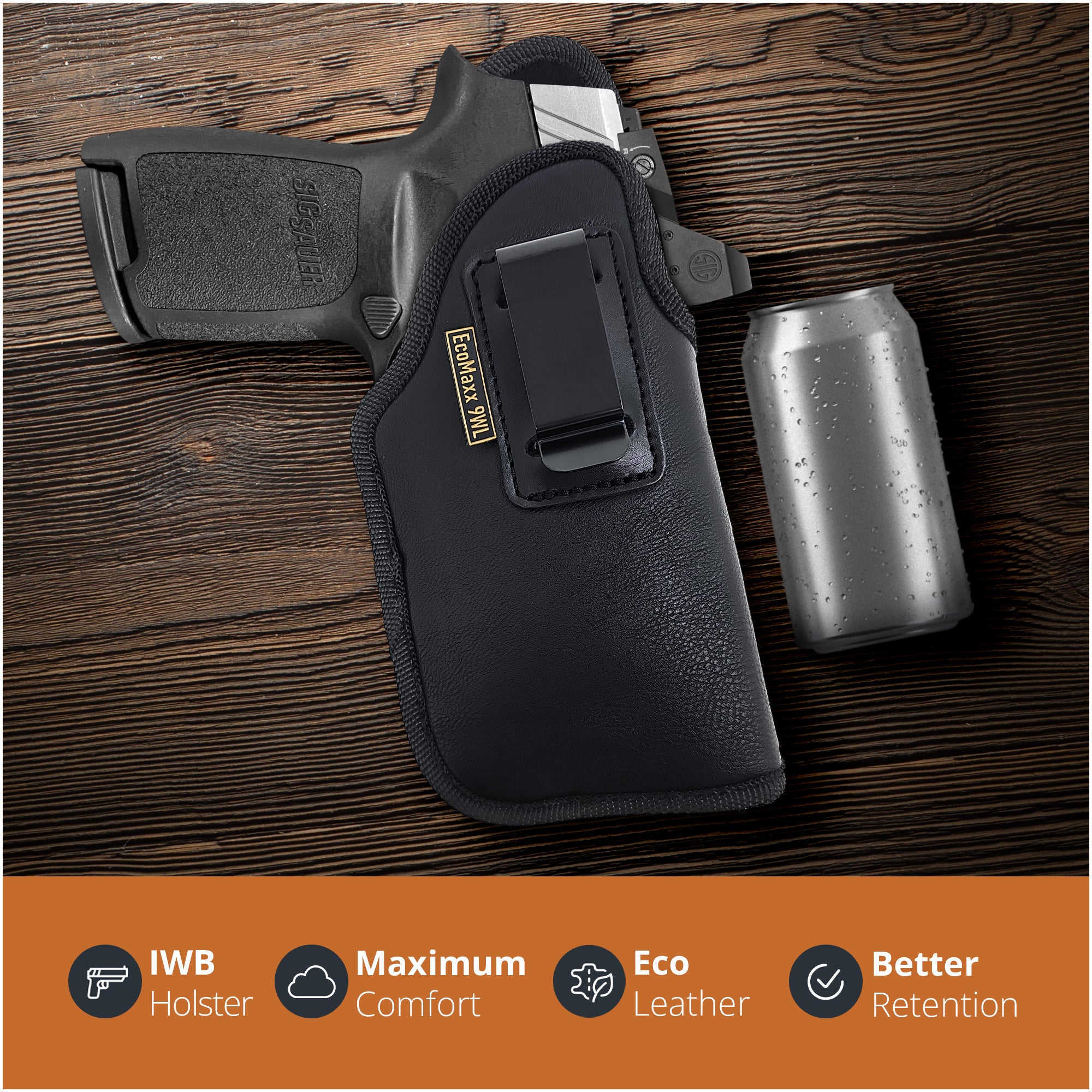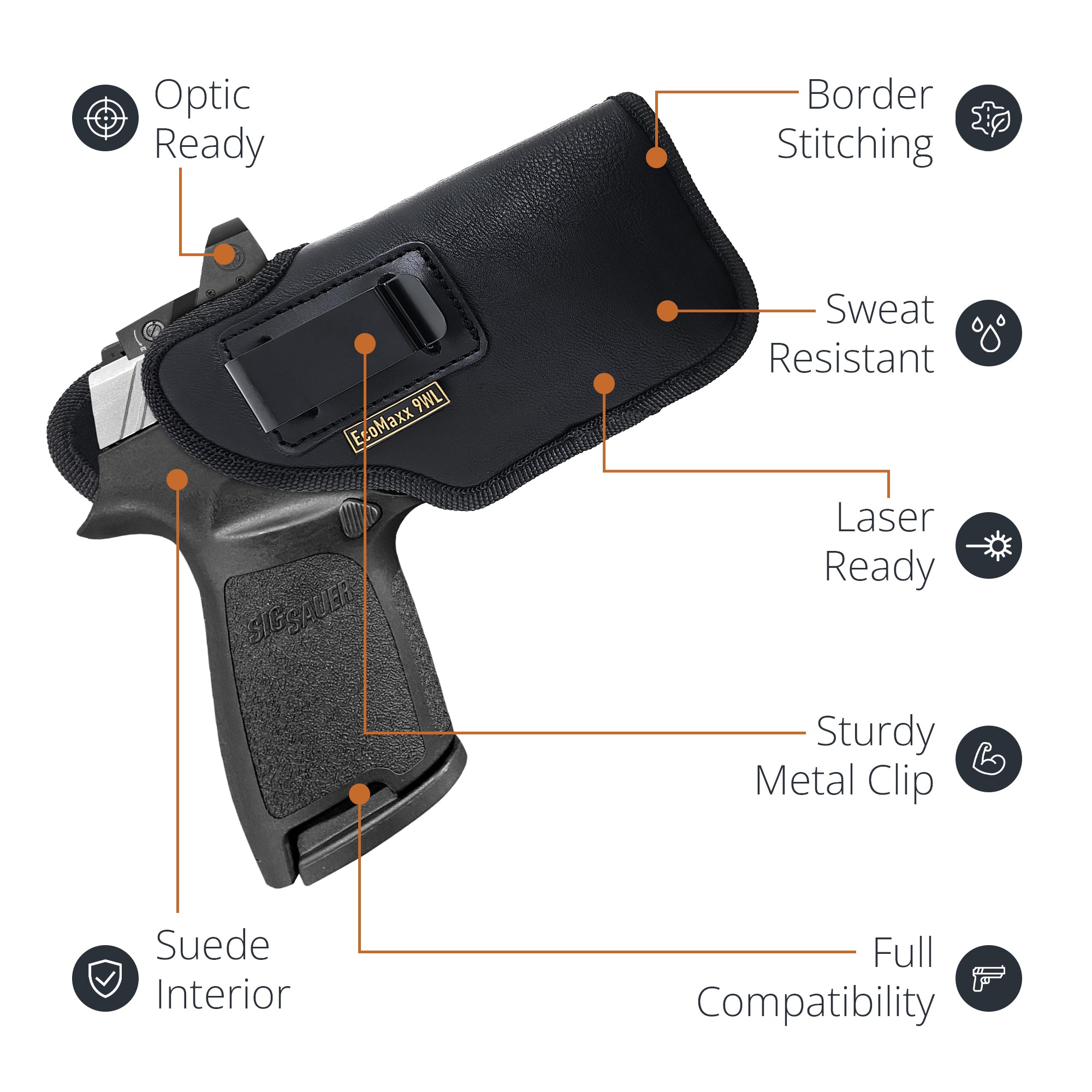 Maxx Carry Optic Ready Compact Eco Leather IWB Holster. Compatible with Canik METE MC9 Prime; CZ 75S, P01, P07, P10; FN 509 Mid, FNS 9; Glock 19, 23, 30, 30S, 32, 48; H&K P2000 Compact, P30, USP Subcompact, VP9, VP40; Hi-Point Sub-9; Kahr CW45, P9, PM45; Keltec P17; Mossberg MC2c 9mm; Ruger Security 9 Compact; S&W SD VE 9/40; SAR 9; Sig Sauer P224, P225, P228, P229, P250C, P320 Subcompact & Carry, P365 AXG Legion; Springfield XD-E, XD Mod.2, XD-S 4.0, XDM 3.8"; Taurus G3c, SC2, TH9C; Walther CCP, PK380, PPS; Hellcat Pro 3.7; 1791 size C1; Most Sub Compact 9/40/45 with Laser. Pistols with light or flashlight flush with the muzzle like the following lights or laser: Streamlight: TLR2, TLR6, TLR7/8; Viridian: C5L; Crimson Trace: LL810, LGA36; ArmaLaser: TR23; Railmaster: CMR-206; Olight: PL Mini 2 Valkyrie; Surefire: X300. Right Hand.