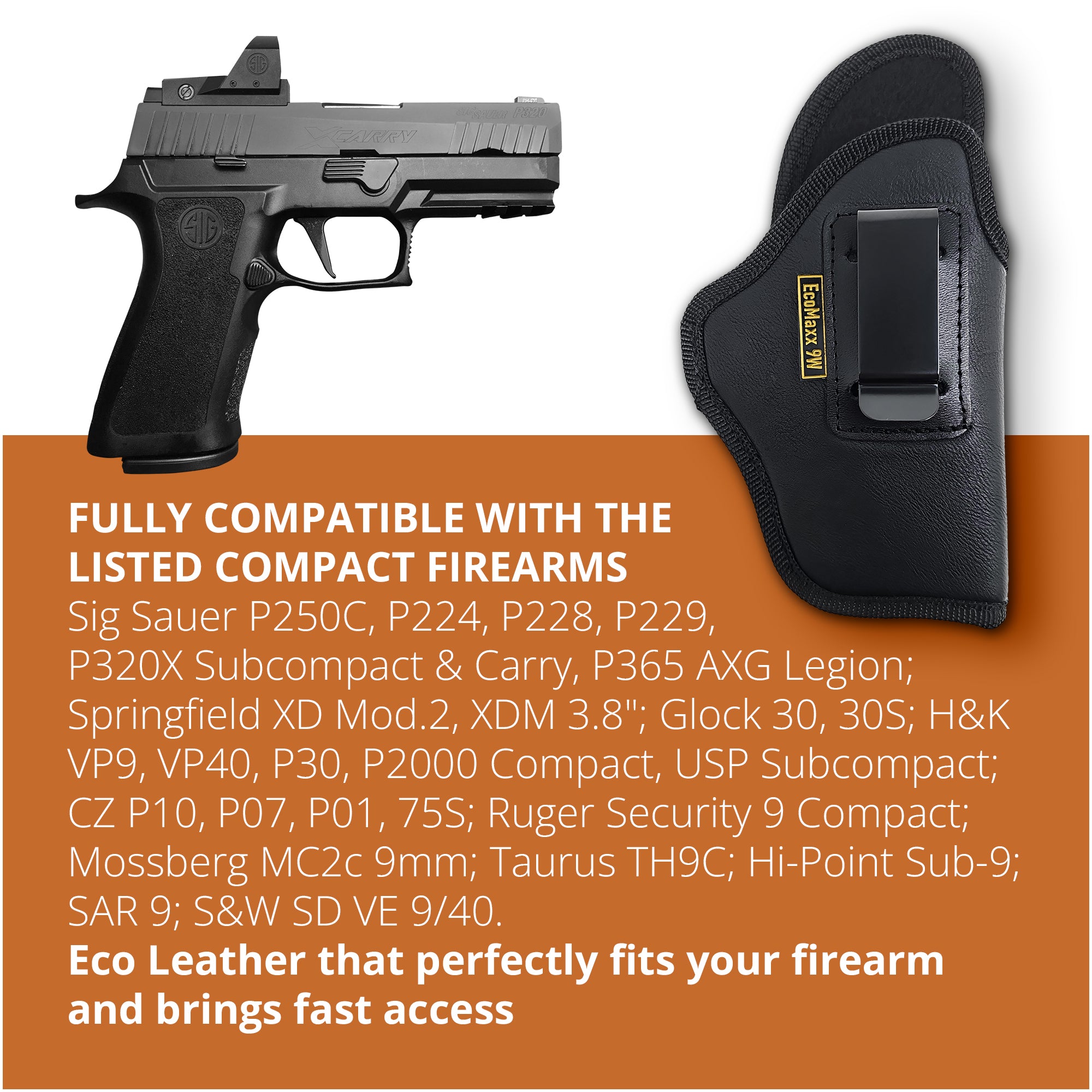 Compatible with Sig Sauer P250C, P224, P228, P229, P320X Subcompact & Carry, P365 AXG Legion; Springfield XD Mod.2, XDM 3.8"; Glock 30, 30S; H&K VP9, VP40, P30, P2000 Compact, USP Subcompact; CZ P10, P07, P01, 75S; Ruger Security 9 Compact; Mossberg MC2c 9mm; Taurus TH9C, G3X; Hi-Point Sub-9; SAR 9; S&W SD VE 9/40, Walther PDP C, FN 502 Tactical, Rost Martin RMIC. Right Hand.