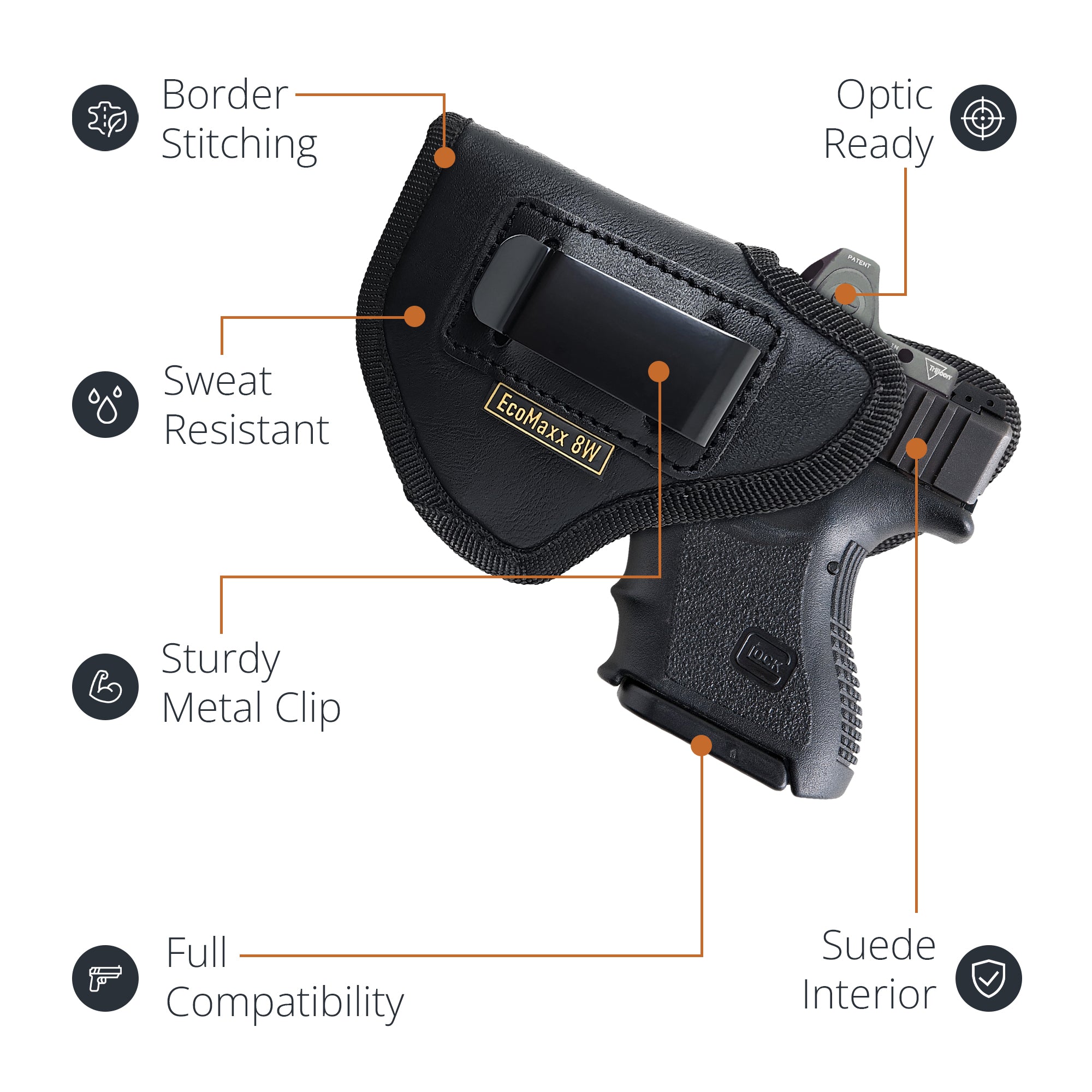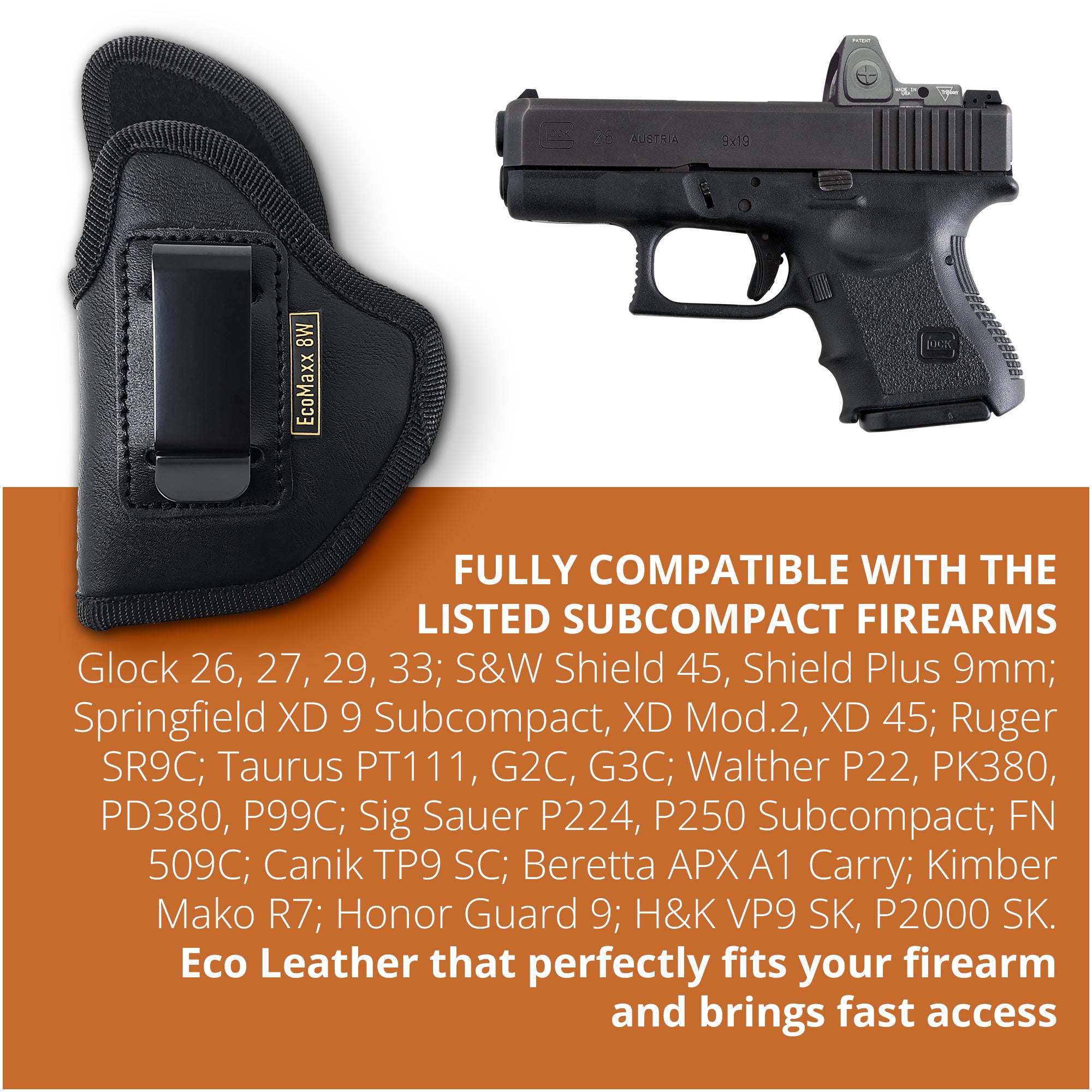 Compatible with Glock 26, 27, 29, 33; S&W Shield 45, Shield Plus 9mm; Springfield XD 9 Subcompact, XD Mod.2, XD 45; Ruger SR9C; Taurus PT111, G2C, G3C; Walther P22, PK380, PD380, P99C; Sig Sauer P224, P250 Subcompact; FN 509C; Canik TP9 SC; Beretta APX A1 Carry; Kimber Mako R7; Honor Guard 9; H&K VP9 SK, P2000 SK, Mossberg MC 2SC Microcompact, SAR 9 SubComp.