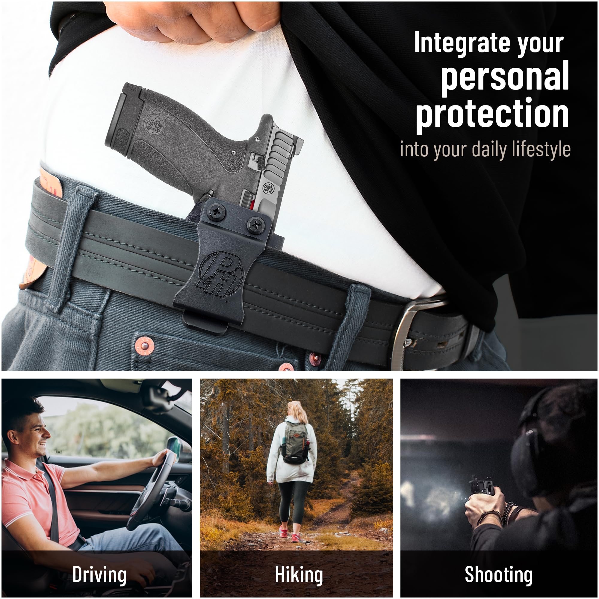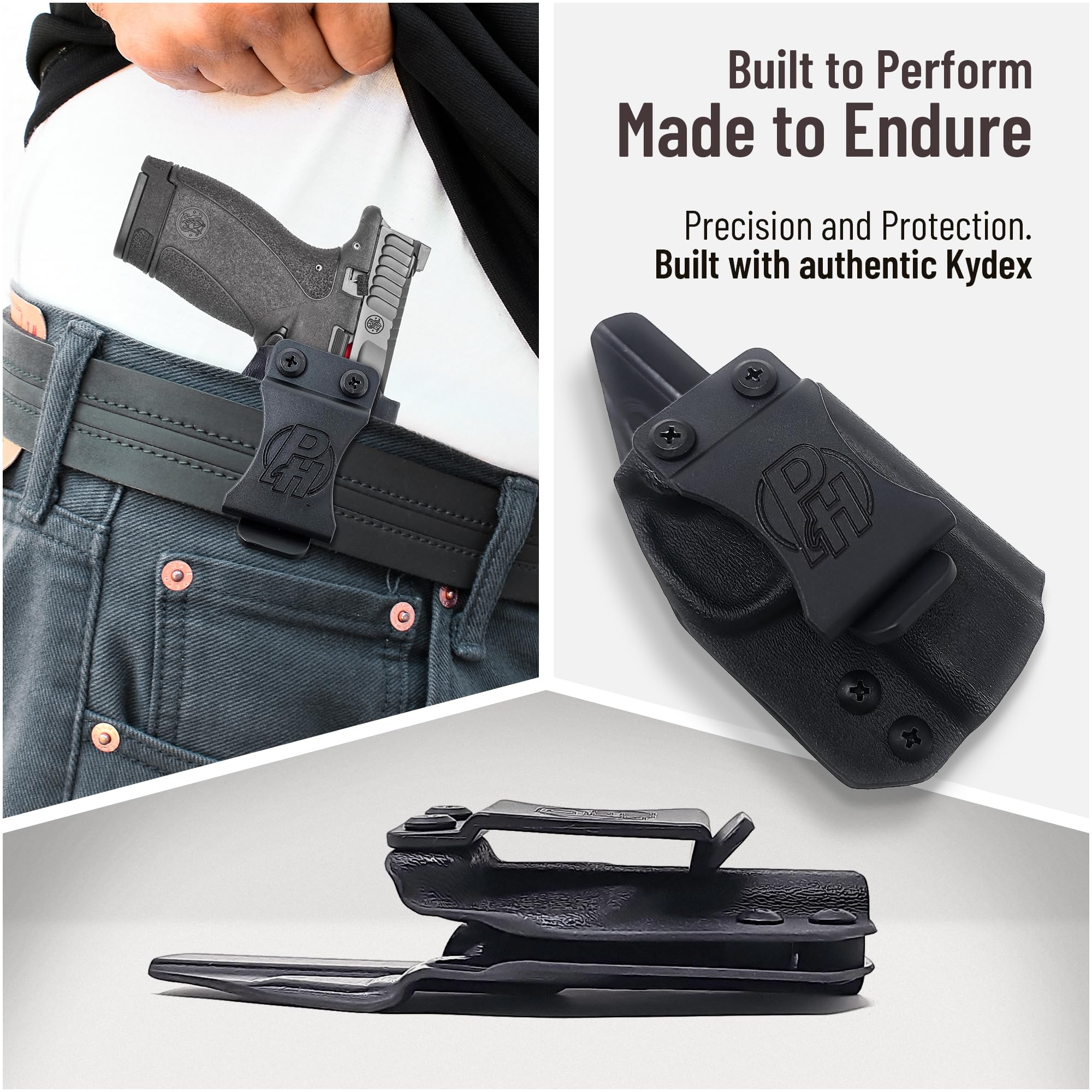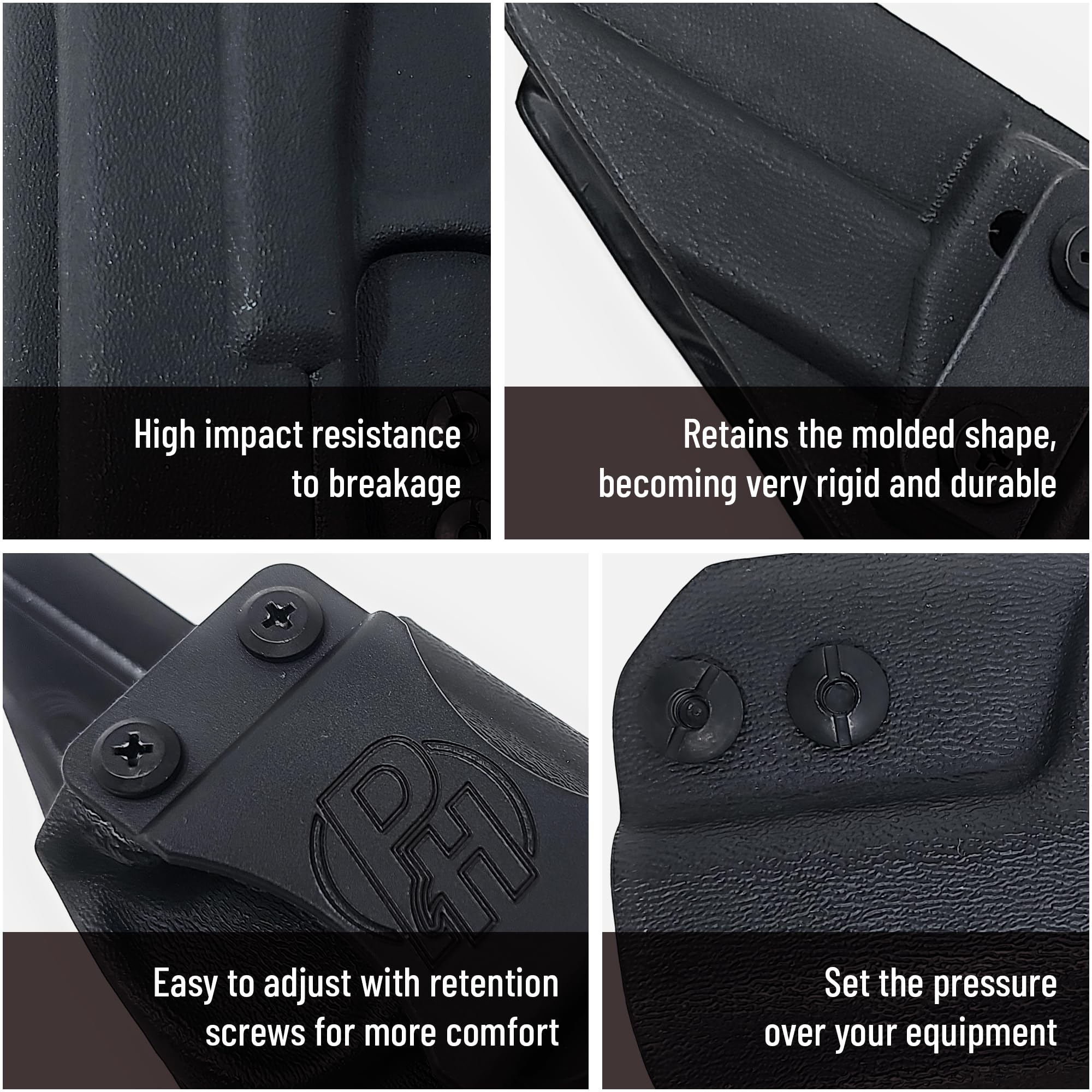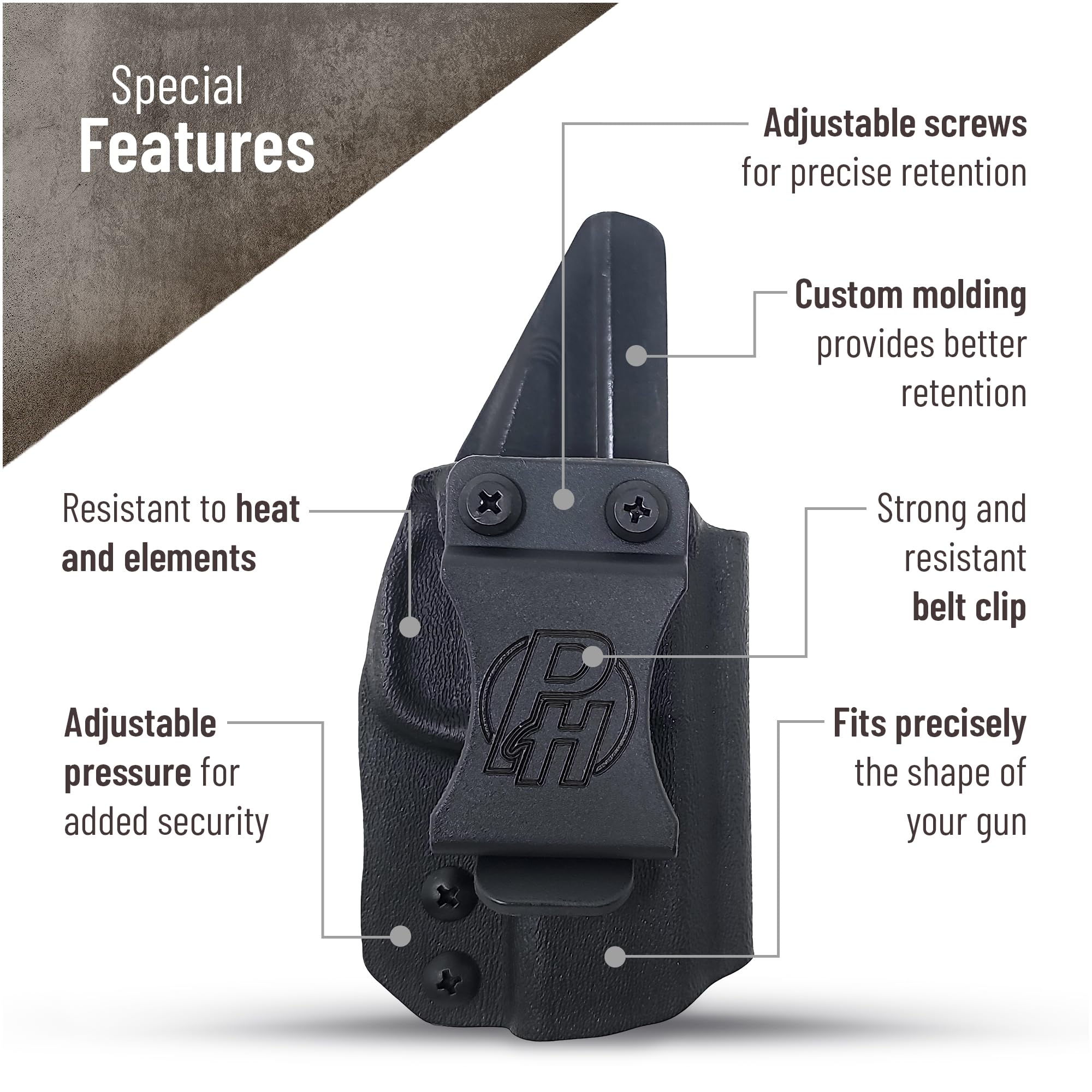 Kydex adapts to the shape of your pistol, and is sweat and weather resistant, making it great for continued use.