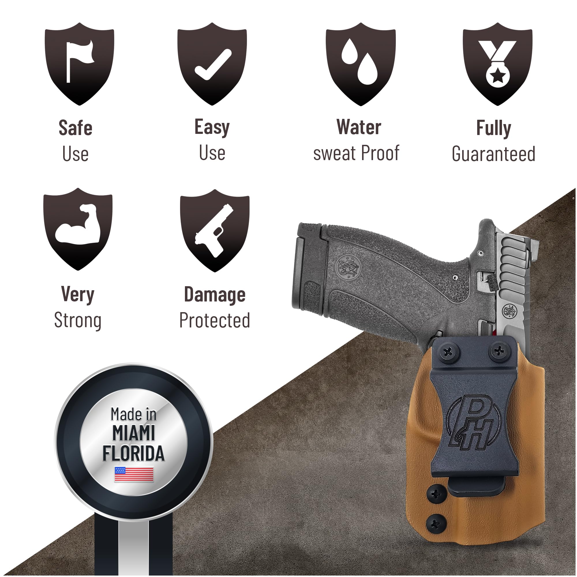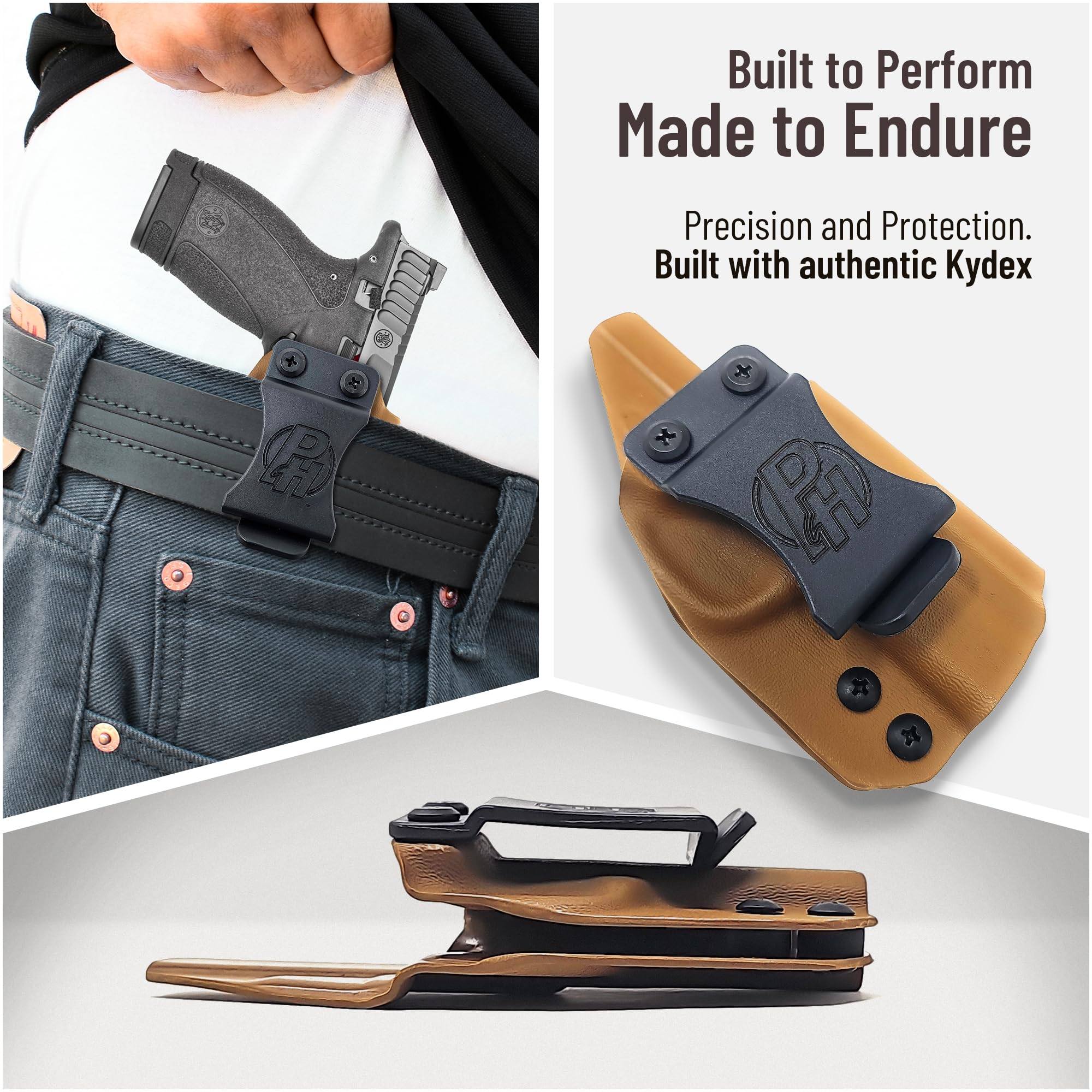 Kydex adapts to the shape of your pistol, and is sweat and weather resistant, making it great for continued use.